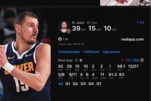 据数据媒体Real Sports统计,这是历史上首次出现中锋对决同场砍下30+三双。