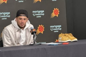 赛后,布克带着库里赛前热身亲穿的Book1球鞋(布克的签名球鞋)参加了新闻发布会。鞋子的上面有库里的亲笔签名及寄语。