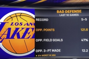 湖人过去10场5胜5负,场均失分121.6分(联盟第六差),对手投篮命中率47%,对手场均命中12.2个三分。