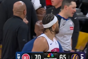 GIF-CC认为这回合被犯规,0.5秒死球时向裁判抱怨吃到技术犯规,东契奇罚球命中