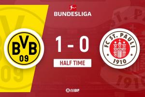 半场-多特蒙德暂1-0圣保利 布兰特破门施洛特贝克阿德耶米染黄