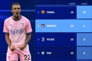 上一篇: 五大联赛U21进球榜:亚马尔10球居首 克鲁皮、伊尔迪兹、帕斯各8球